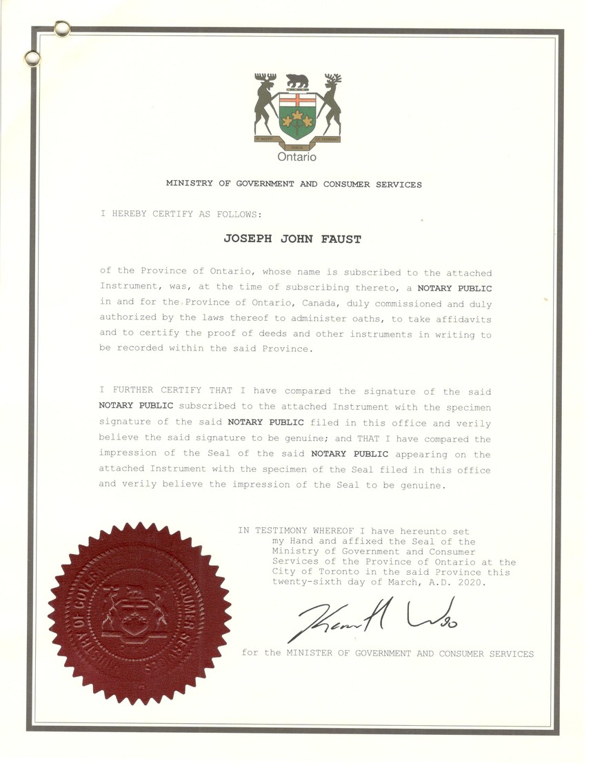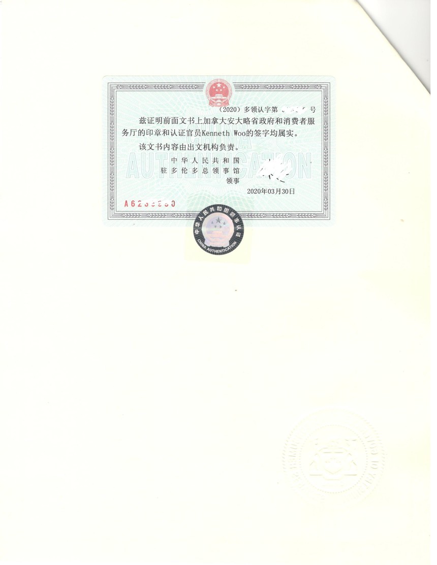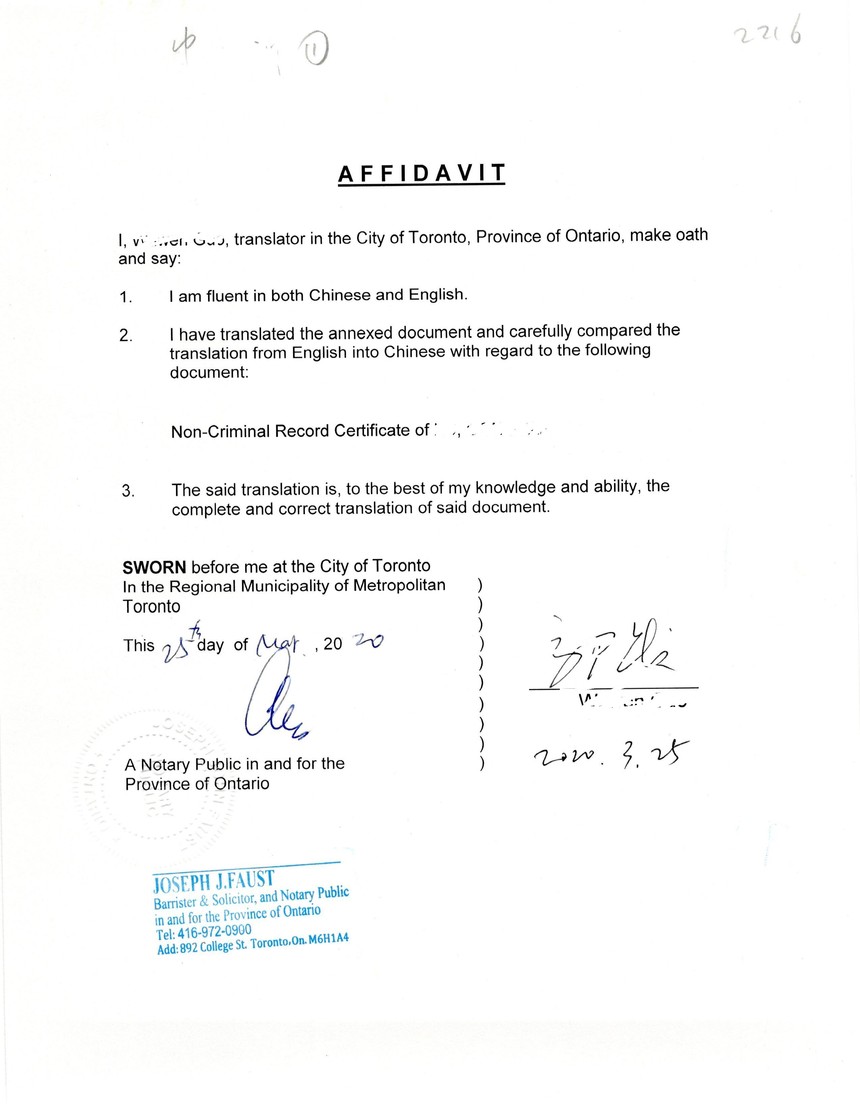 加拿大多伦多公证处公证认证样稿