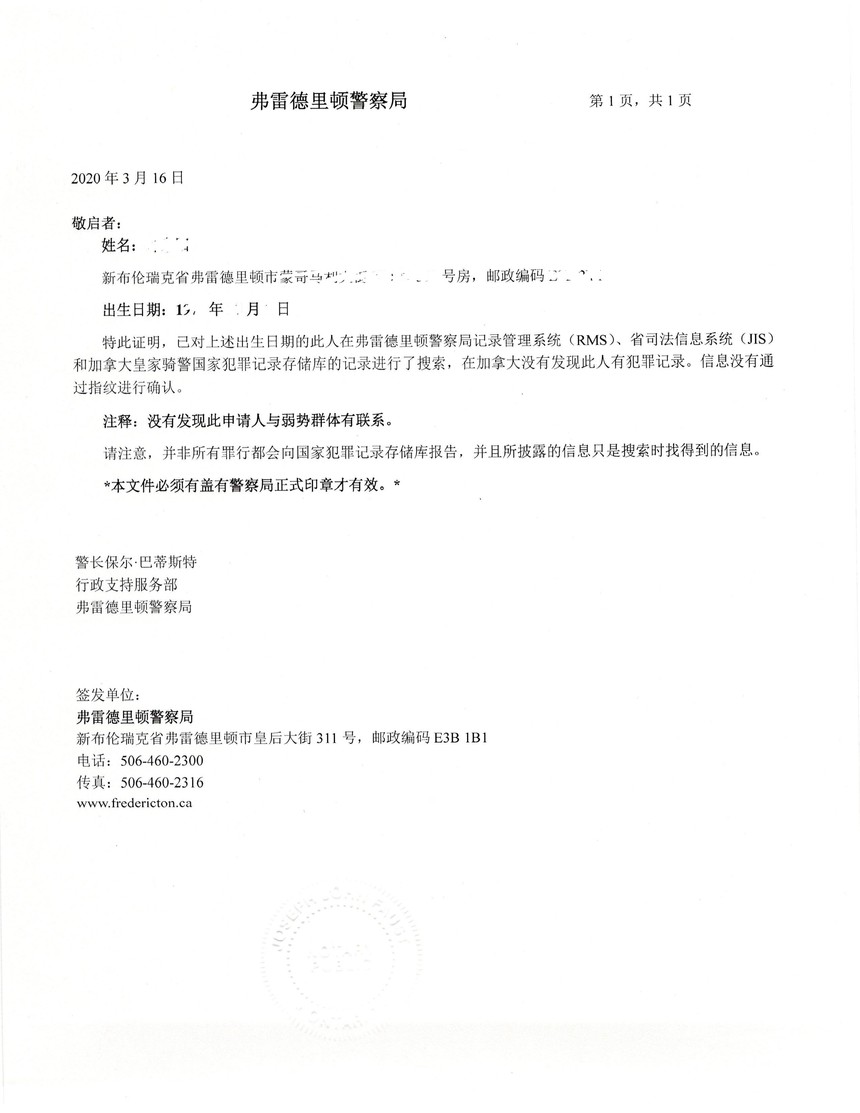新不伦瑞克省无犯罪证明领事馆三级认证