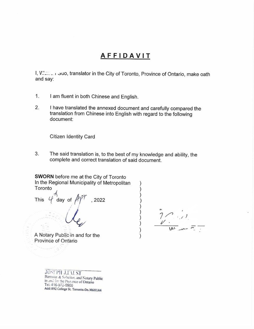 加拿大多伦多公证处公证认证样稿