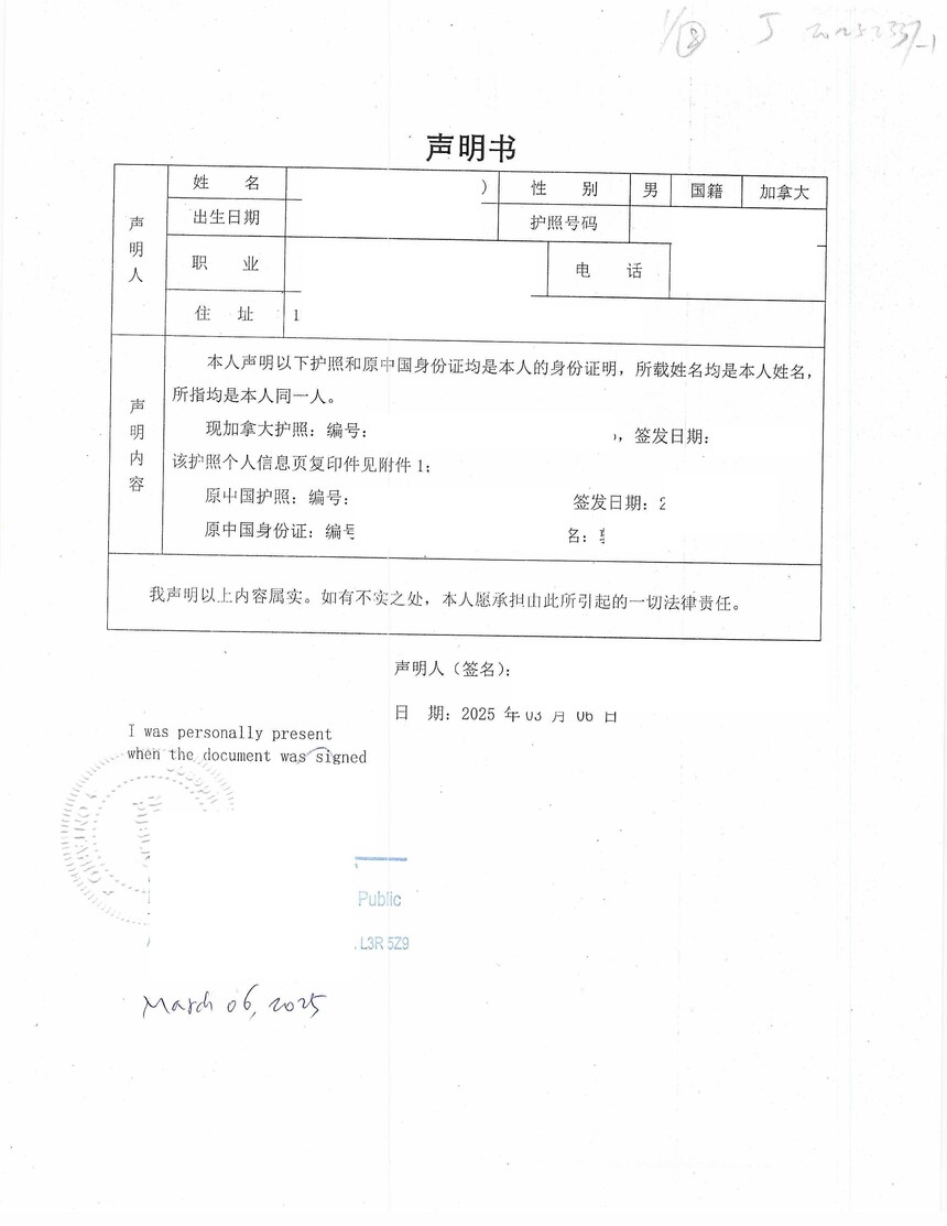 安排加拿大新斯科舍省的持牌律师对“同一人声明”进行公证,确保文件的真实性和法律效力。