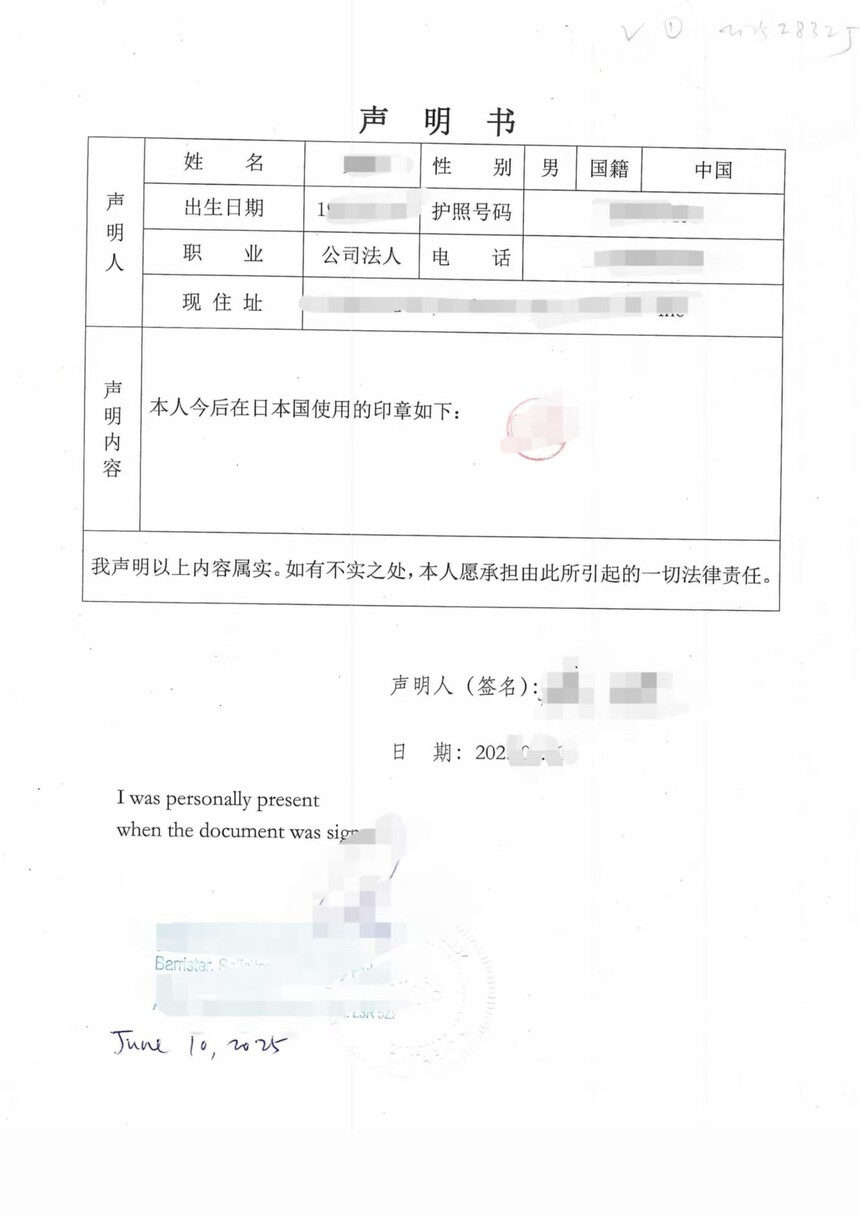 本声明真实无误,供日本相关机构使用。