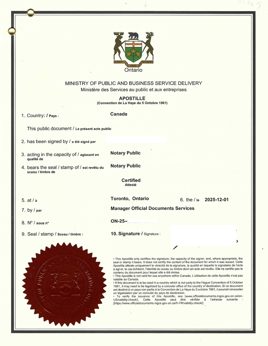 ✔ 必须经过 加拿大公证 + 海牙认证(Apostille)