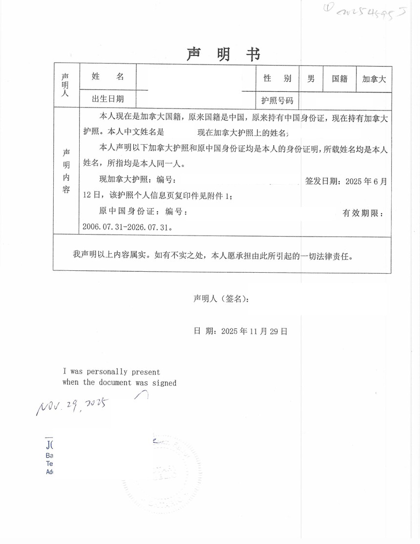声明下方由加拿大持牌公证人签字、盖章,并附本人护照复印件。