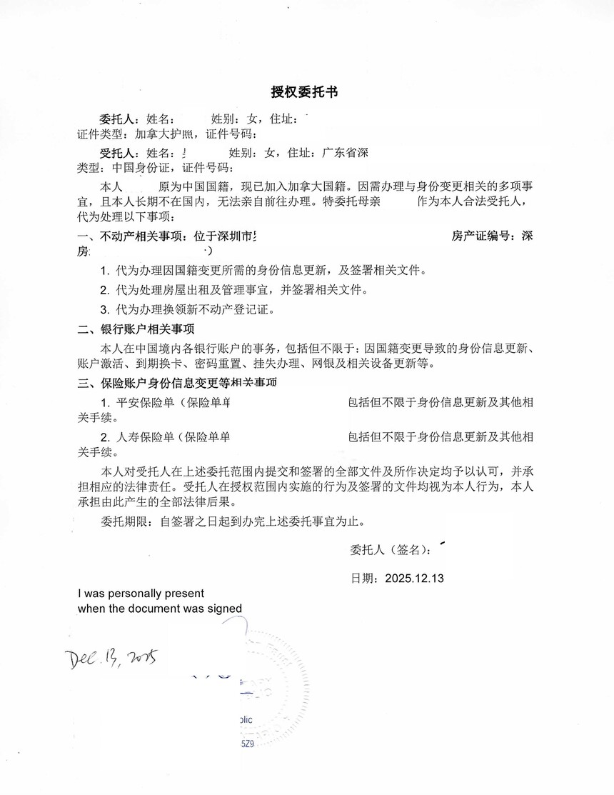本案属于典型的入籍加拿大后办理中国房产、银行及保险账户信息变更情形。通过规范授权文件、清晰说明身份变化事实,并配合加拿大公证及海牙认证,海外华人可在不回国的情况下,高效完成国内资产与金融信息更新,避免后续使用受限。