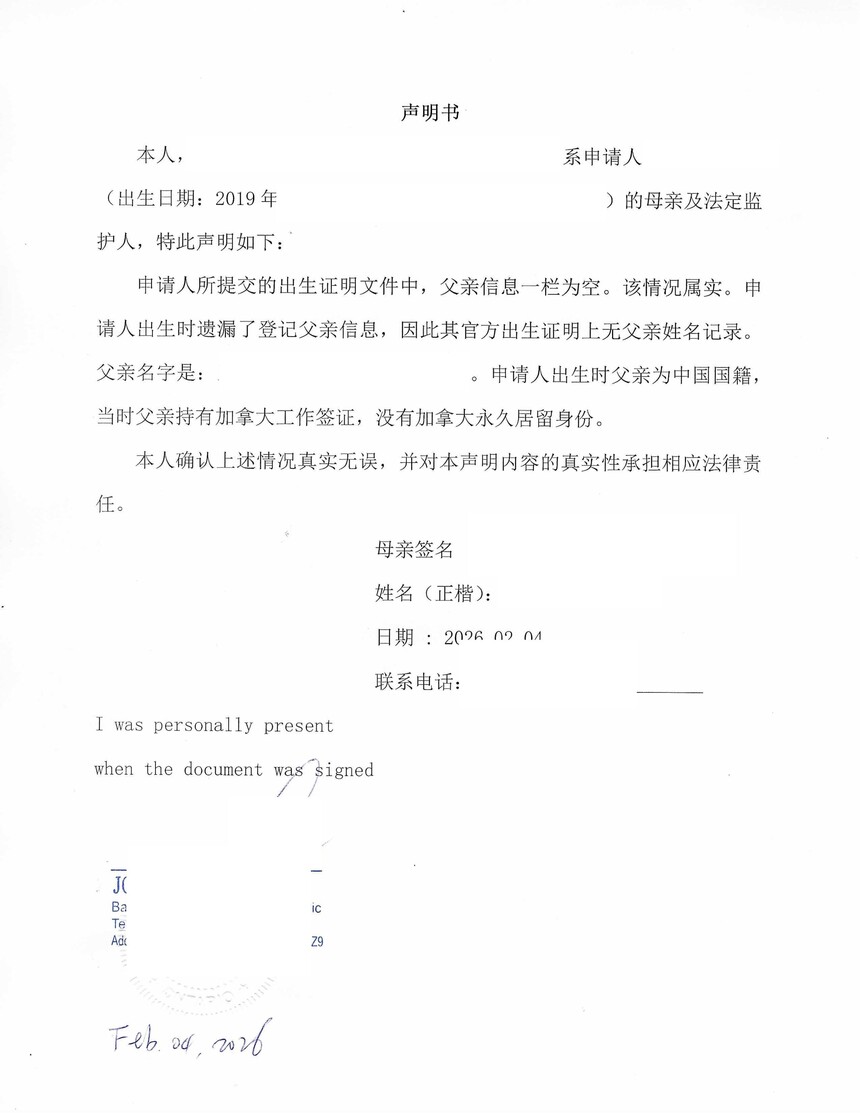 最近一次委托中,客户需要出具父亲在加拿大的身份情况证明,用于为孩子向中国有关部门申请中国旅行证。由于孩子的出生证明中部分信息存在缺失,中国使领馆要求补充说明材料。我们根据实际情况,协助客户准备声明文件并完成公证,确保内容符合领馆审核逻辑,避免反复补件。