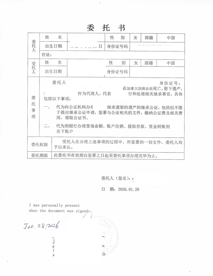 ×î½ü¸Õ¸ÕÍê³ÉµÄ£¬ÊÇÒ»·ÝÒŲú¼Ì³ÐίÍÐÊéµÄº£ÑÀÈÏÖ¤£¬ÓÃÓÚÊÚȨ¹úÄÚÇ×Êô´úΪ´¦Àí¼Ì³Ð¼°ÒøÐÐÏà¹ØÊÂÎñ¡£ÎÒÃÇÔÚ³ä·ÖÁ˽â¼ÒÍ¥±³¾°ºÍÎļþÓÃ;ºó£¬ÐÖúÕûÀíÄÚÈÝ¡¢°²ÅżÓÄôóÖ´Òµ¹«Ö¤Ô±µ±ÃæÇ©Ê𣬲¢Óɰ²Ê¡Õþ¸®Íê³Éº£ÑÀÈÏÖ¤£¬Á÷³ÌÇåÎú£¬Ã»Óз´¸´¡£
